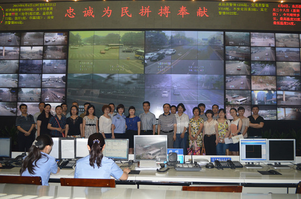 接著大家來到鐫刻有“忠誠為民、拼搏奉獻”字樣的全市交通路況顯示屏前。大屏幕上顯示著鄭州市各個主要單位、部位和重要道路交叉路口的即時信息,具有GPS定位功能的警車在不停地移動,視頻畫面依序切換,“原來每時每刻都有幾百輛警車在街面巡邏,每個路口都有監(jiān)控??礃幼樱嵵菔械陌脖9ぷ鬟€是有保障的,以后更要規(guī)范自己的言行,遵守交通規(guī)則”大家很是感慨。