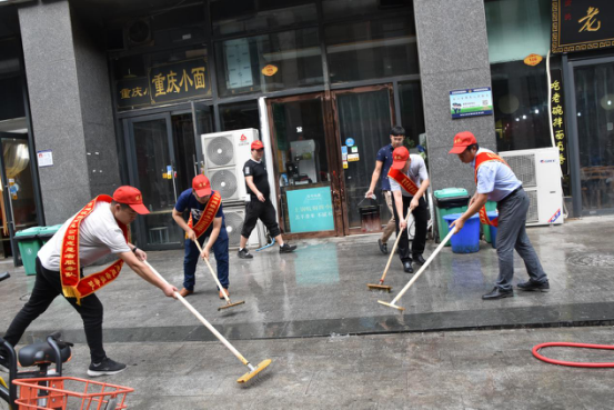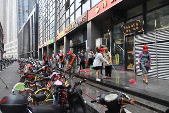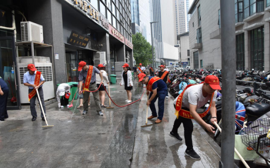 二、“全城清潔”行動(dòng)。清潔家園,黨員志愿者義不容辭。日前,市建投聯(lián)合商務(wù)社區(qū)積極響應(yīng)“全城清潔”行動(dòng)號(hào)召,定期組織志愿者對(duì)社區(qū)單位公共區(qū)域、沿街商戶門店等內(nèi)外環(huán)境進(jìn)行集中整治。7月14日下午,市建投黨員志愿者分赴中國(guó)人保大廈對(duì)沿街商戶門店和街道進(jìn)行集中清理。大清掃活動(dòng)采取包干打掃、分頭行動(dòng)的方式,集中對(duì)沿街商鋪門店垃圾桶(池)、地面污漬等進(jìn)行清洗,全面清理整治各類衛(wèi)生死角,清理積存垃圾,杜絕垃圾亂堆亂放。烈日炎炎,市建投黨員志愿者們絲毫不懼37度的高溫,頭戴小紅帽,戴著紅袖標(biāo),以高度的敬業(yè)態(tài)度和為人民服務(wù)的無(wú)比熱情,全身心投入到環(huán)境衛(wèi)生清理中,通過(guò)2個(gè)小時(shí)的辛苦勞動(dòng),使人保大廈沿街門店商鋪和街道面貌煥然一新。