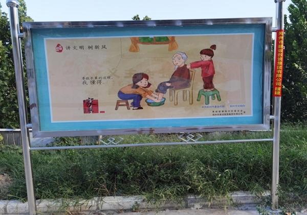 四、設(shè)置宣傳載體,營(yíng)造文明家園濃郁氛圍。今年,集團(tuán)公司為郭崗村提供3萬(wàn)余元幫扶資金幫助其打造了精神文明專(zhuān)欄,分為家風(fēng)家訓(xùn)(名人家風(fēng))專(zhuān)欄,“講文明 樹(shù)新風(fēng)”(孝當(dāng)先、傳承家風(fēng))、“文明健康 有你有我”公益廣告等內(nèi)容,使社會(huì)主義核心價(jià)值觀深刻融入到村民的生產(chǎn)生活和精神世界,形成全體村民的修身行善共識(shí)和明禮守法自覺(jué),為促進(jìn)郭崗村經(jīng)濟(jì)健康發(fā)展、構(gòu)建美麗鄉(xiāng)村、文明家園打下良好根基。